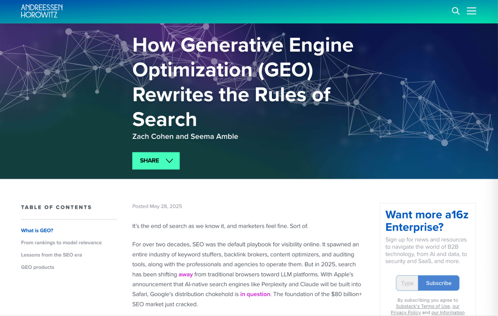(a16z 的這篇文章,讓「GEO 升 SEO 降」的口號被到前所未有的新高)